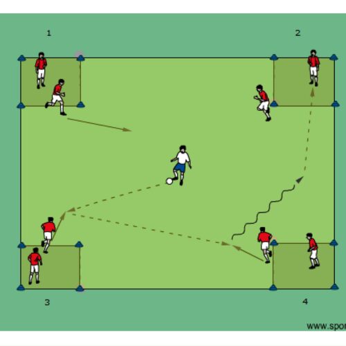 - the defender passes a ball to any of the other three players and all of them become attackers to make 3 v 2