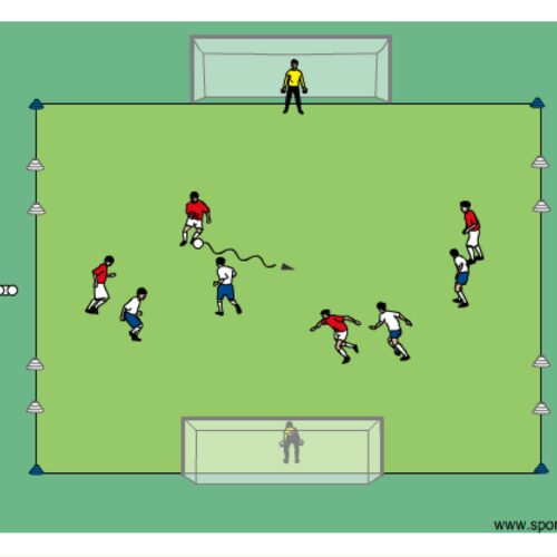 - each team is assigned one side line (with cone goals) and one reg. goal to defend