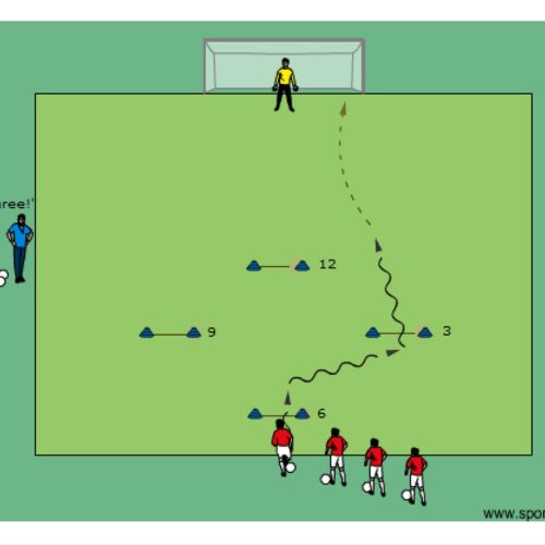 • coach calls out two goals to which the first player has to dribble through and then finish on goal