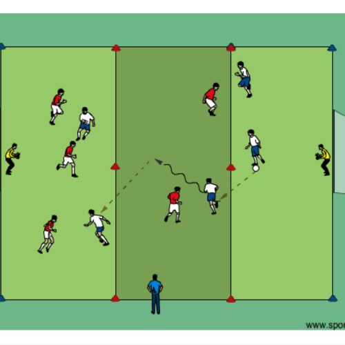 - 2 touches max. in defending and attacking third (free play in middle zone)