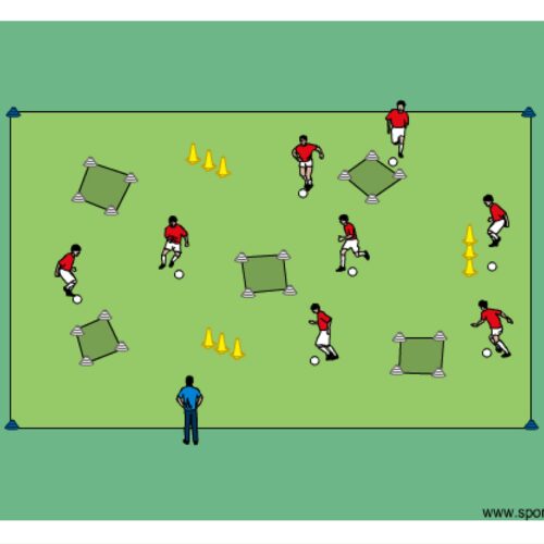 • players perform specific moves (Cruyff, Scissor etc.) inside squares and in front of cone walls