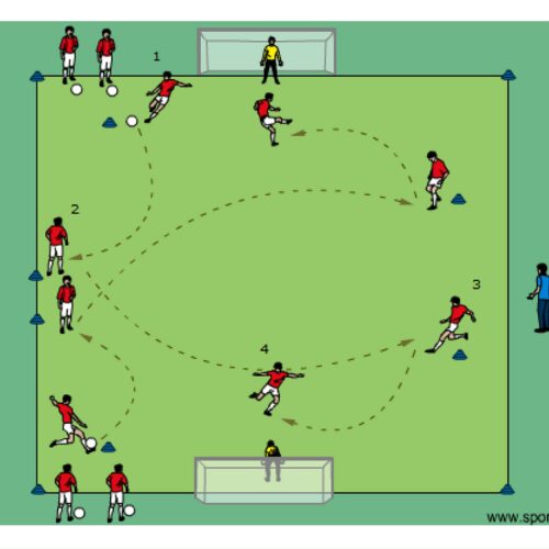 - players pass (two-touch) and finish on goal in the sequence as shown