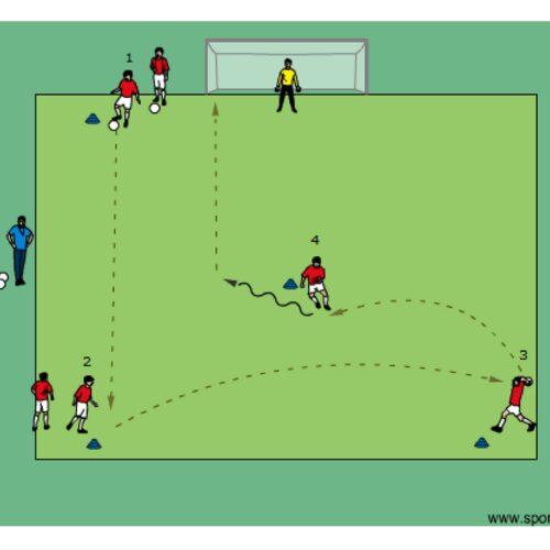 • player 3 throws the ball to player 4 who receives the ball out of the air and finishes on goal on his third (second) touch