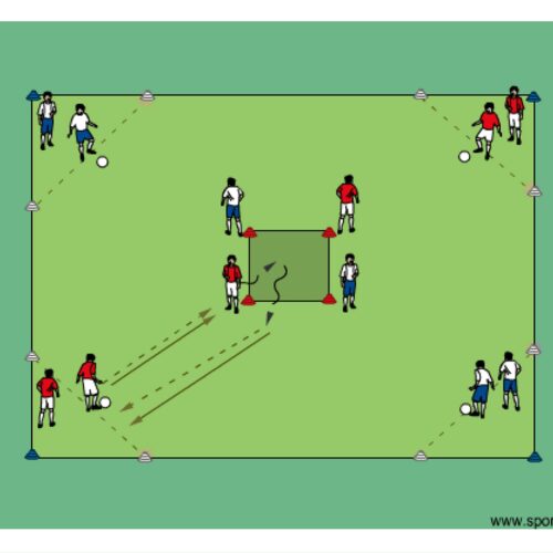 • corner player passes to an inside player who then turns and dribbles the ball around the nearest cone and