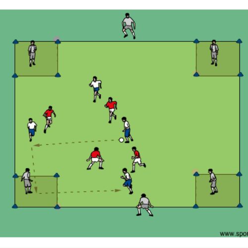 - players attempt to pass into target area to player who connects to a third teammate with a 1 or 2 touch pass in
