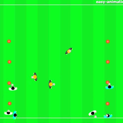 - first player dribbles zig zac around cones and then diagonally back to the other team’s corner as shown