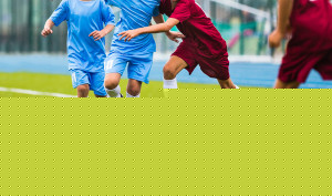 Young soccer players running towards soccer ball. Football soccer game for youth teams. Children playing soccer match