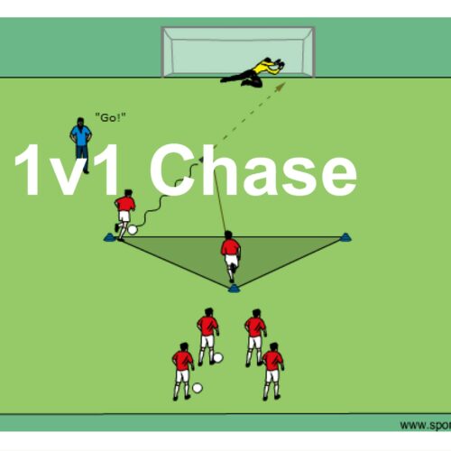 - on coach’s command the attacker dribbles towards the goal with the defender chasing him trying to block his shot