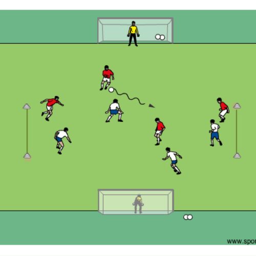 - each team defends one cone goal and can score on either goal with goalkeeper