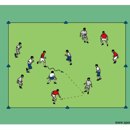 - play with a designated defending team who must win the ball and then pass it to coach (who moves around the grid) 5 times to switch roles with an attacking team