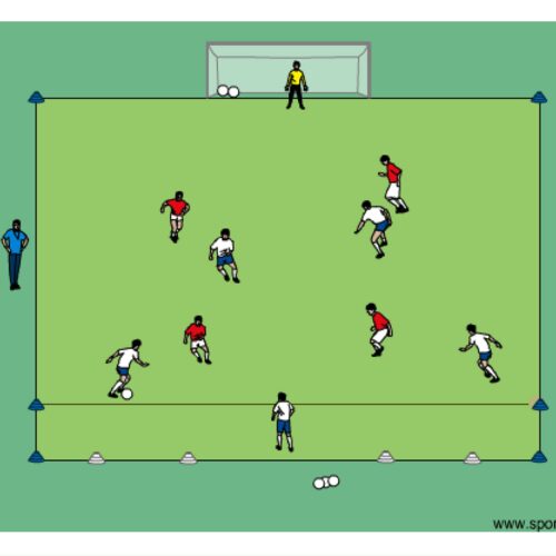 • attacking team defends 2 cone goals with sweeper keeper (keeper covers both goals)