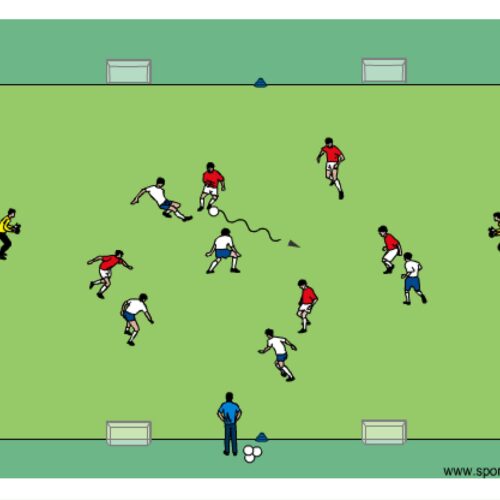 - each team has to defend 2 mini goals and one goal with goalie