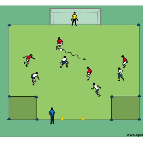 - defending team scores by dribbling into a corner zone or through center cone goal with control