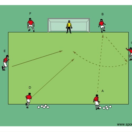 - player A passes to player B who lays it off to player C who then crosses the ball in for player D + E