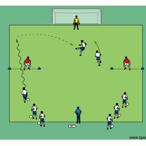 • first player with the ball attempts to dribble through cone goal and then cross the ball towards the