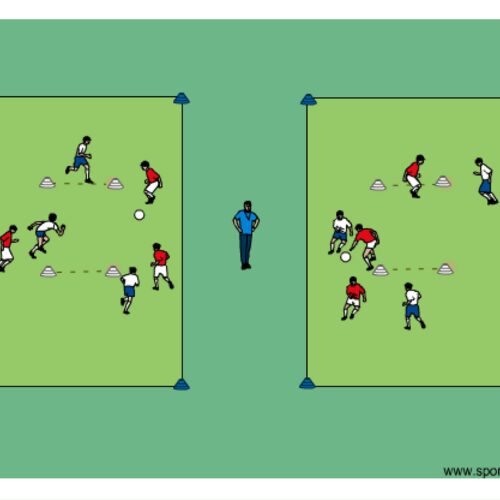 - teams score by dribbling through a cone goal and then connecting a pass to a teammate