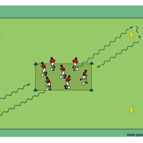- on coach’s command all players dribble around a cone from the large grid and then dribble back into the small grid