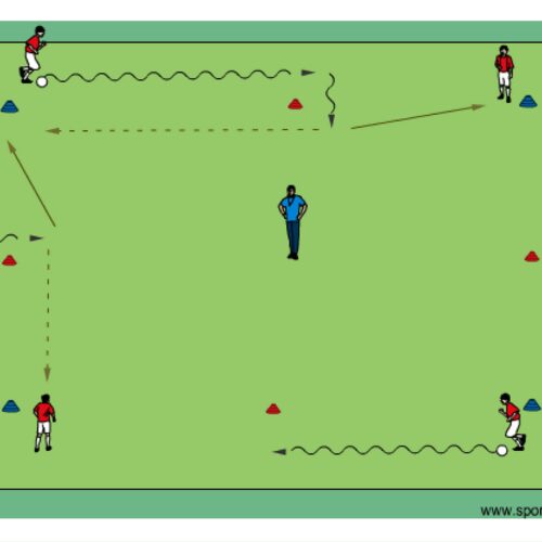 - players make a self pass towards the middle cone, catch up with it and dribble around the cone and then pass back and move to the next corner