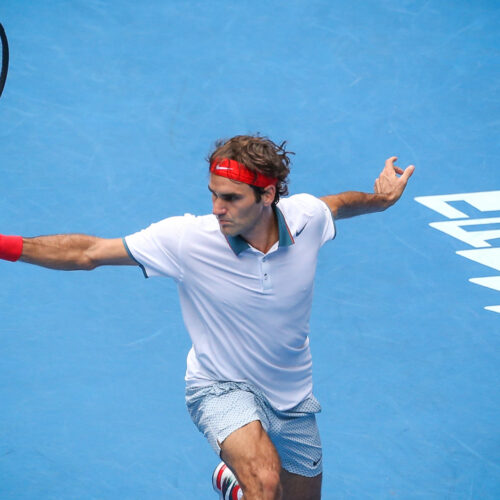 After accelerating through the hitting zone on a ground stroke, don’t try to stop or slow down the follow-through but rather allow it to elongate in a natural way. Often this will result in the follow-through wrapping around the neck. Having a longer distance to slow down the racket in the follow-through prevents strain on your arm and shoulder. The old teaching adage of hit and hold the finish out in front, in most cases, does not apply.